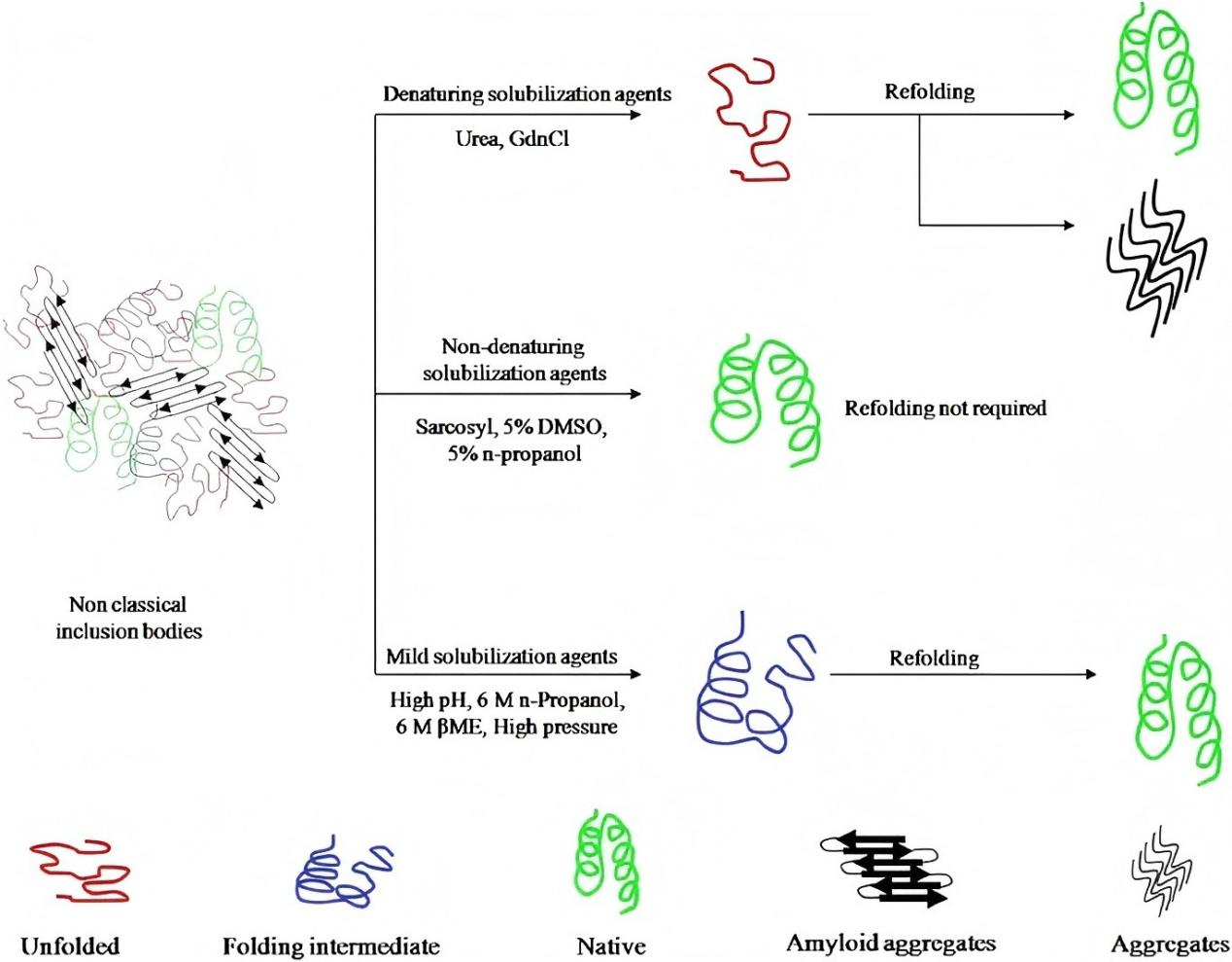 对于那些仍然以包涵体形式表达、难以获得高比例可溶性的蛋白,其次的思路是通过“性质调控”使包涵体更易被溶解/复性。主要方法包括: