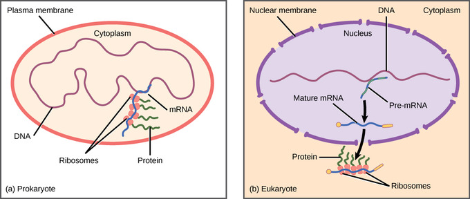 在原核系统,转录与翻译可以耦合进行(翻译可以在 mRNA 尚未完全合成时就开始)。真核系统中,这两步在不同细胞区室,需经过完整的前体 RNA 加工。
