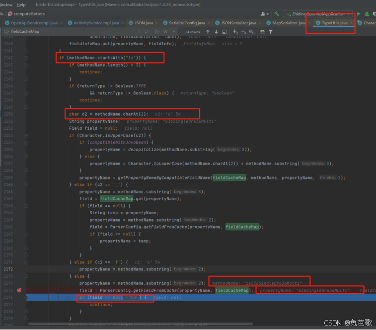 debug到TypeUtils是fastjson的类,当字段是is开头时,处理字段的is后面又恰好是数字,就把is去掉了,结果就找不到了。