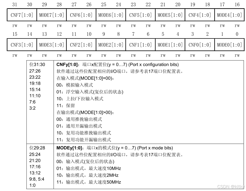 这里一位IO口占据4个位,分别是2位CNF和2位MODE,从下面的描述可以看出MODE主要控制的是IO选择输入还是输出。输出的最大翻转的速度是多少。CNF就是选择相关的输入输出模式。这里注意。该如何选择何种模式碰到再详细介绍。