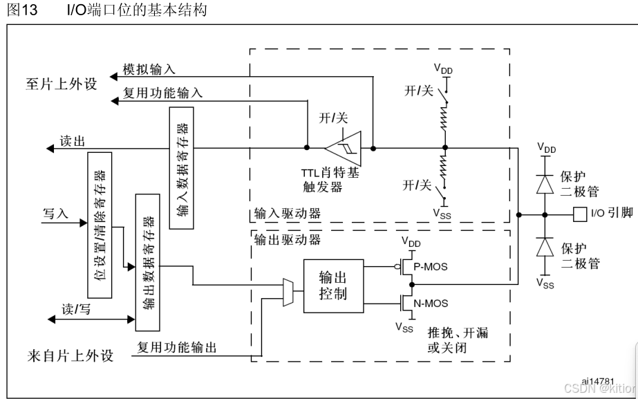 再看读出部分,从IO口进来,首先经过一个上拉和下来的选择。可以简单想做是在没有读数时,IO口电平由该设置选择。可以选择上拉,下拉,都不拉也就是浮空(此时的IO口电平并不稳定)。在之后就进入到一个施密特触发器,这个触发器的作用在数电中有详细描述,需要的可以去详细了解,之后进入到输入数据寄存器保存。我们就可以通过该寄存器读取IO口的输入电平了。