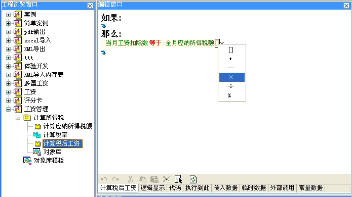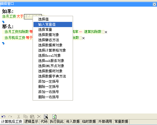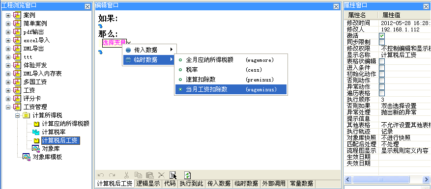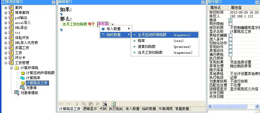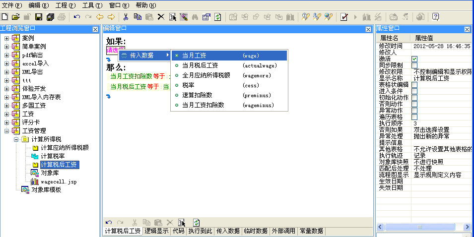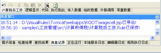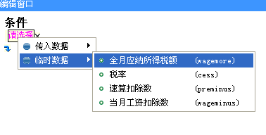 这样临时数据中的变量就转移到传入数据中来了。转移完成时候,我们就可以通过测试窗口看到计算过程中的这些中间值了。选择“计算所得税”规则包的测试窗体,点击