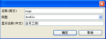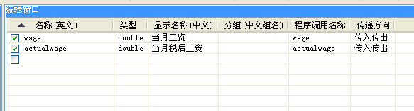 可以通过双击传入数据的最后一个选择行,在其“名称(英文)”中,输入wage,然后回车之后,会添加一行。在这一行的“类型”位置处,双击,选择“double”。在“显示名称(中文)”位置处双击,输入当月工资。这样就新建完成wage变量的定义。