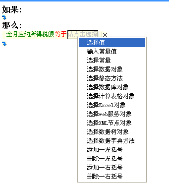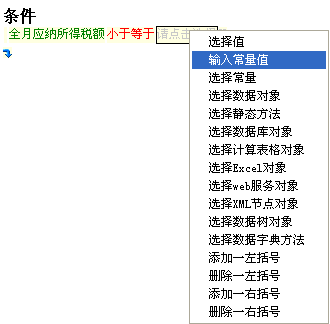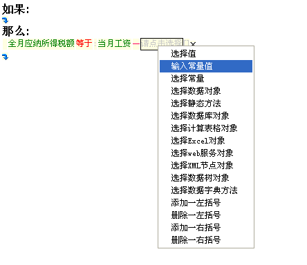 然后会出现 全月应纳税所得额 等于 请点击选择, 点击“请点击选择”,在出现的弹出式菜单中,选择“选择值”: