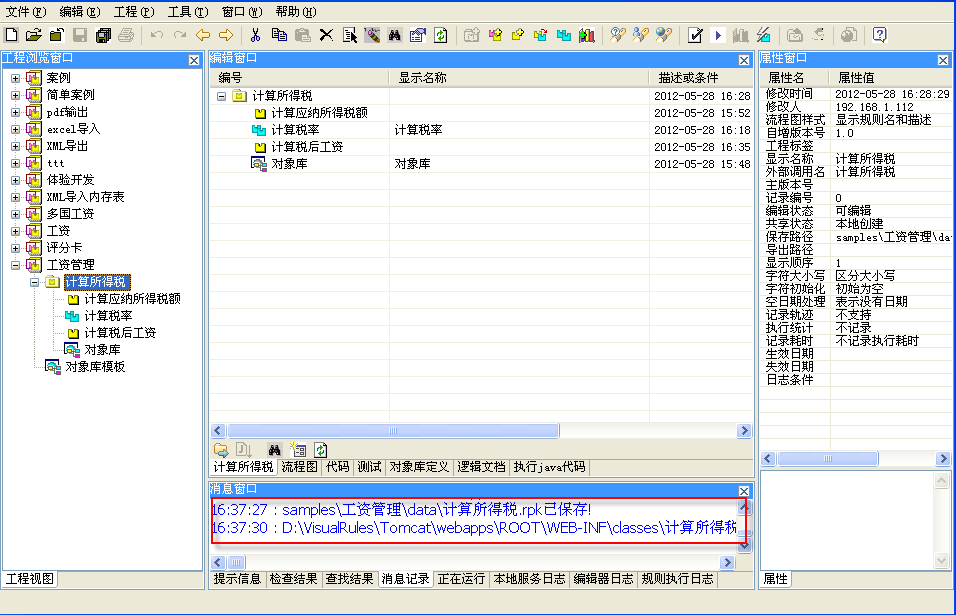在点击工具栏中的保存按钮,保存该规则包。规则包会自动编译,并且将编译后的规则包更新到tomcat的工程中。