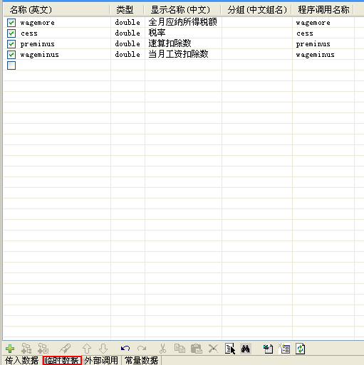 和设置传入数据同理,再继续设置几个临时变量数据,包括全月应纳税所得额,税率,速算扣除数,当月工资扣减数。如下图所示: