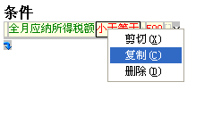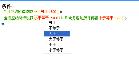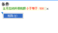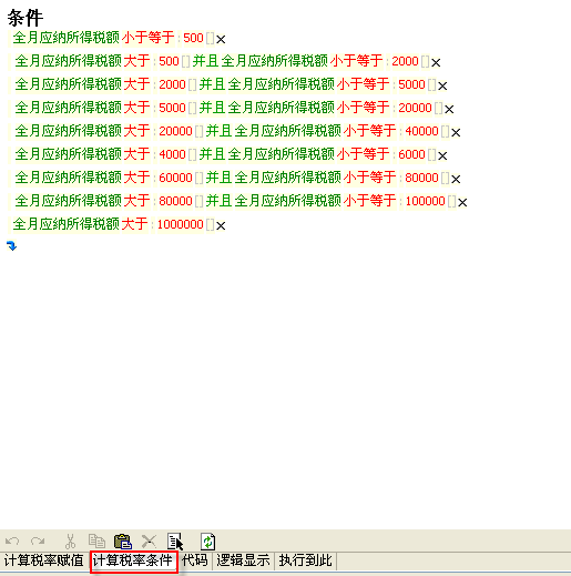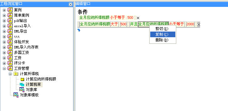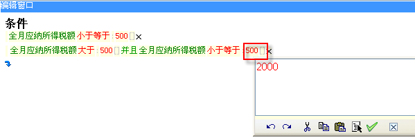这样 “全月应纳税所得额 大于 500 并且 全月应纳税所得额 小于等于 2000” 的条件就设置完毕了,我们可以以此来复制,粘贴多个类似的规则包。