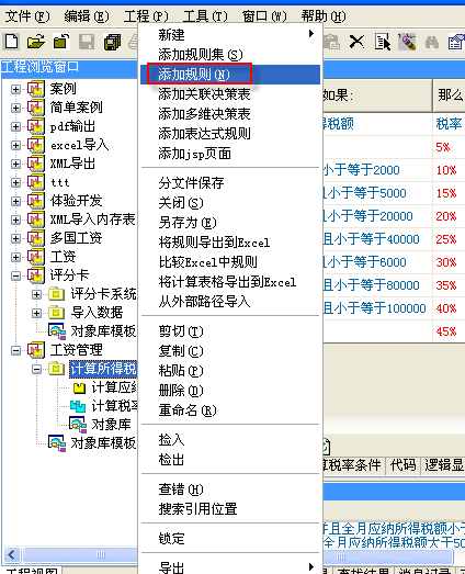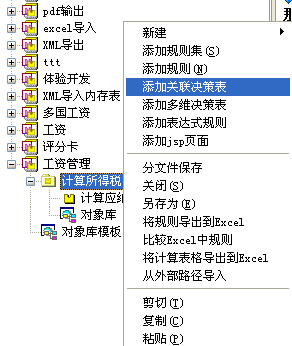 右键点击“计算所得税”规则包,然后选择“添加关联决策表”: