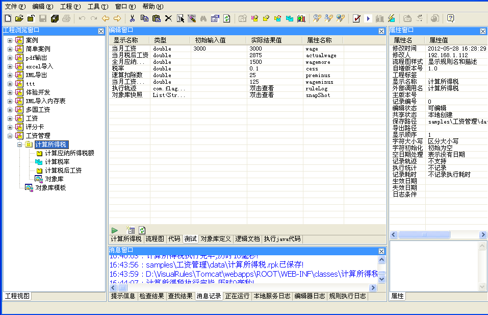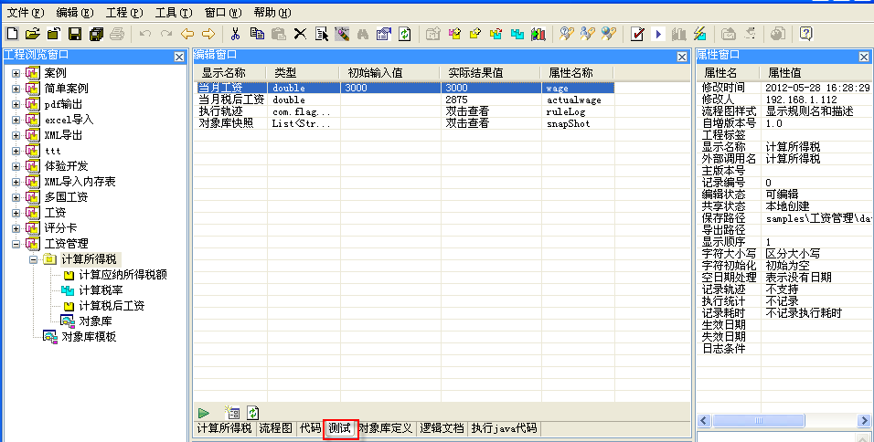 通过将规则包编译,并且自动保存到指定的规则包缺省导出路径中后,就可以在规则配置器中,对规则包进行执行测试。首先在工程视图中,点击计算所得税规则包,在中间的编辑窗口中,点击“测试”窗体,出现如下的操作界面。在这个操作界面中,列出了规则包的传入数据(外部调用接口),将当月工资的初始输入值,设置为3000,然后点击