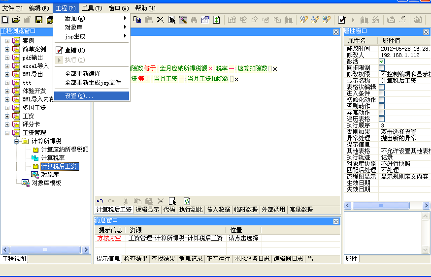 在规则配置器的工程菜单下面,选择“设置(S)…”菜单项,出现如下窗口: