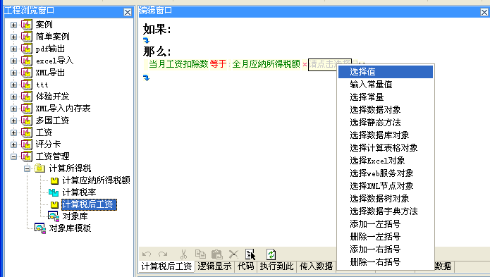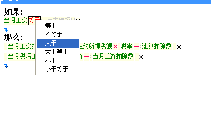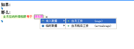点击计算税后工资规则,在其编辑窗体的如果下面,点击 按钮,会添加一个条件,点击“请选择”,选择传入数据的“当月工资”: