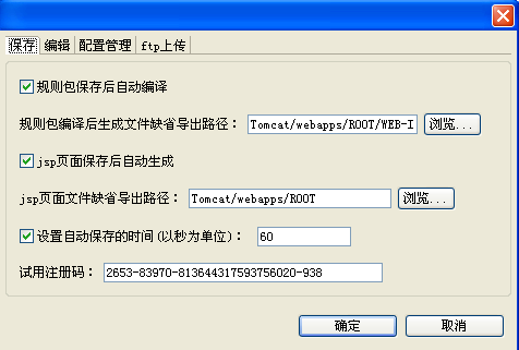另外为了实现通过jsp方式测试时,jsp页面的工程和规则包编辑文件导出的tomcat工程一致。可以设置“jsp页面保存后自动生成”,并且jsp页面文件缺省导出路径为软件自带的tomcat的ROOT工程。