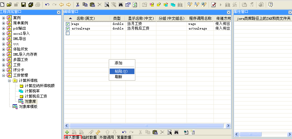 首先我们设置对象库,你可以点击对象库,在传入数据中,添加两个变量。其中一个为wage,表示当月工资,类型为double,另外一个为actualwage,表示税后工资,类型也为double。