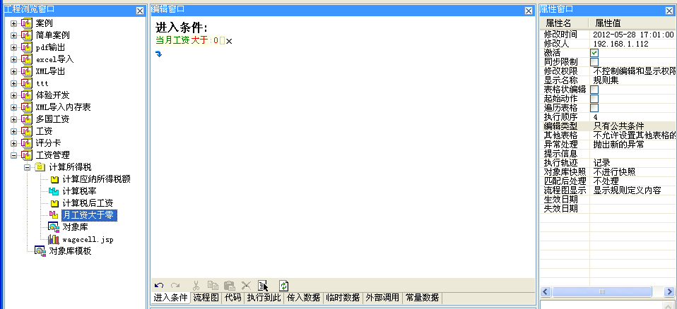 选择后,该规则集会出现要求设置进入条件的编辑窗体,设置进入条件为 当月工资大于0,这个条件也可以直接从在“计算税后工资”规则的条件中复制过来。