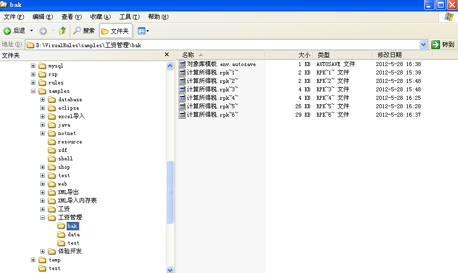 保存完成后,软件还会将历史版本加以保存,存放在规则工程所在目录下面的bak目录下面,如果用户使用后,想恢复以前设置过的规则包。就可以通过这些历史文件来加以恢复。