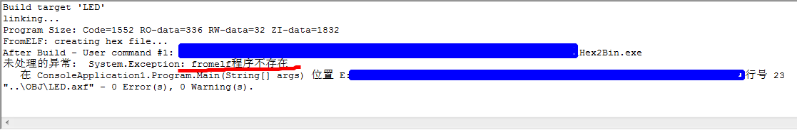 一些错误会有中文的异常抛出提示,如:fromelf.exe路径设置不正确