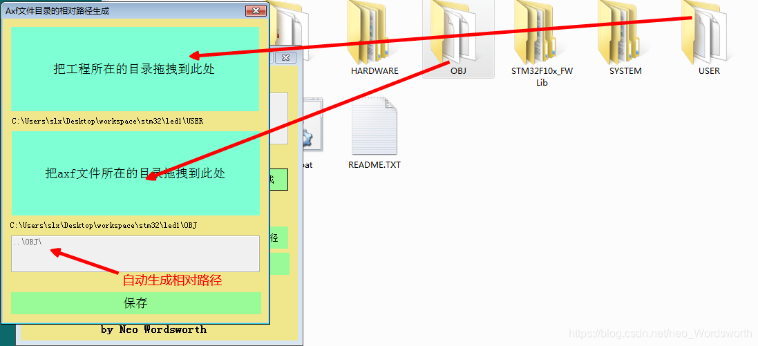 点击“生成”按钮进入相对路径添加界面,分别拖拽 工程目录(如USER目录) 和 输出目录(如OBJ目录) 进入界面,自动生成相对路径,点击保存。