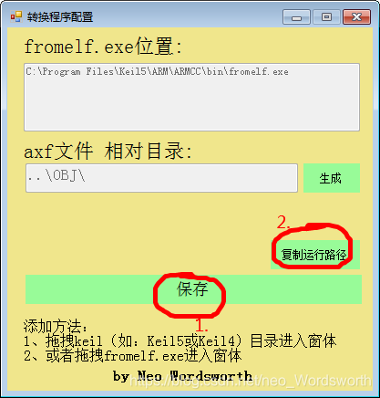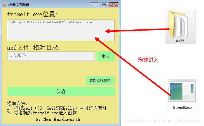 打开配置主程序Hex2BinConfig.exe,拖拽keil目录(或者fromelf.exe)进入。(程序路径一般为Keil目录下的ARM\ARMCC\bin\)