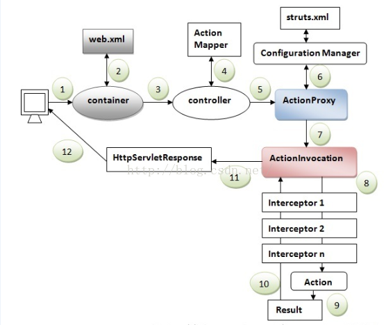 在struts2的应用中,从用户请求到服务器返回相应响应给用户端的过程中,包含了许多组件如:Controller、ActionProxy、ActionMapping、Configuration Manager、ActionInvocation、Inerceptor、Action、Result等。下面根据 struts2.0体系架构图来解析这些组件之间的联系。
