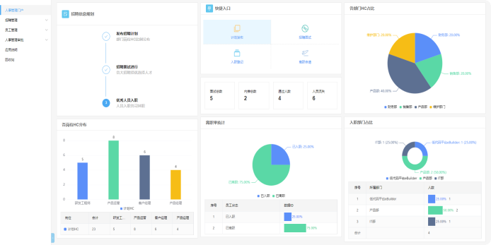 - 招聘管理:帮助组织实现从用工需求提报汇总,人力资源计划编制、岗位多渠道发布、简历获取、人才跟进、面试安排、入职办理一整套招聘体系。