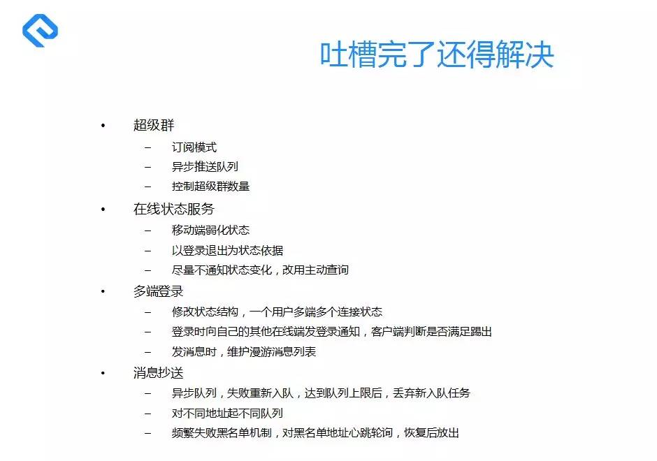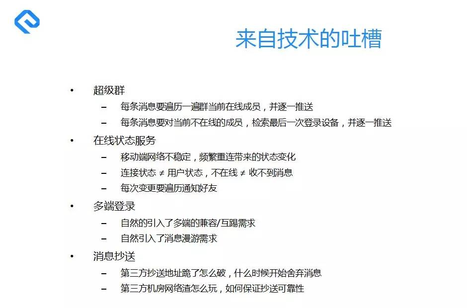 其实,在IM模块开发中,超级群、在线状态服务、多端登陆和消息抄送方面也是经常被开发者吐槽的,阙杭宁解释道,“比如,第三方抄送地址跪了怎么破,什么时候开始舍弃消息?或者,第三方机房网络渣怎么玩,如何保证抄送可靠性?又或者,移动端网络不稳定,频繁重连带来的状态变化等等。“针对这些问题,阙杭宁也给出了很多自己多年主导IM模块开发的经验之谈。