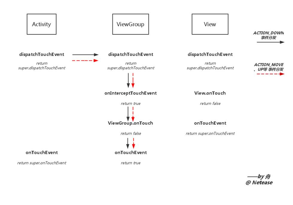 可以看到,当View的onTouchEvent返回true时,当ACTION_DOWN事件分发到View后,就不在会向父层转发,表示此View将会对事件经行处理,之后的ACTION_MOVE等同一序列的事件,都将沿着之前的路径转发给此View。