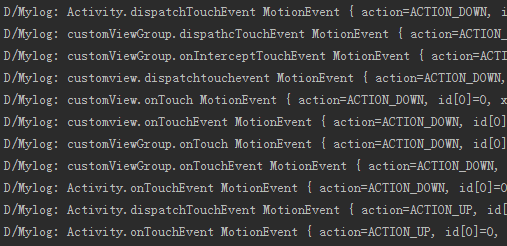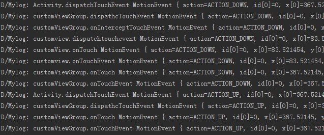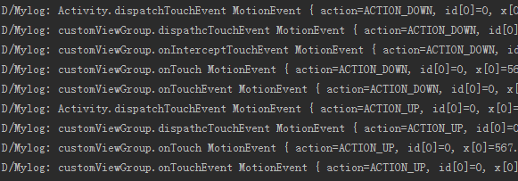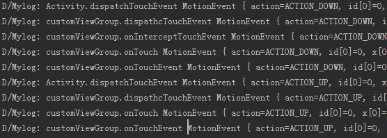 Log.d(TAG, "customViewGroup.dispathcTouchEvent "+ev.toString()); return super.dispatchTouchEvent(ev);