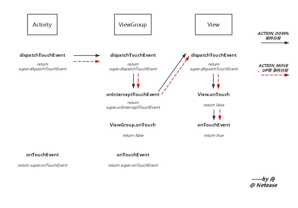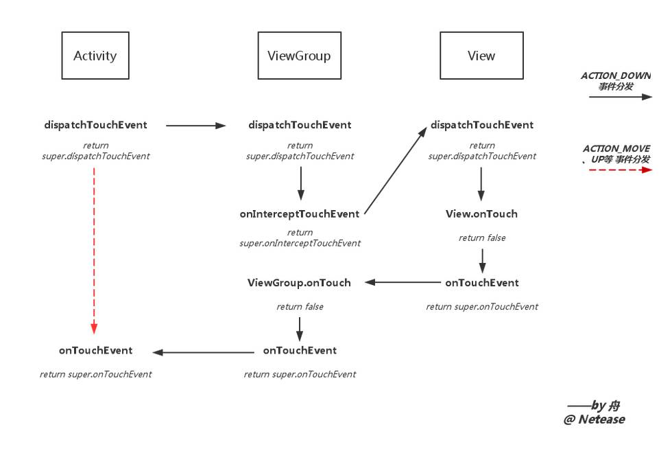 打印出来的Log如上,事件ACTION_DOWN先从Activity的dispatchTouchEvent开始传递,向下分发,由于Activity和ViewGroup默认都是不拦截事件的,因此不会拦截,一直传递到最内侧的View,注意到View的onTouch方法比其onTouchEvent方法先调用,这表示onTouch具有更高的优先级。由于我默认设置view也不处理事件,因此事件最终回到了Activity的onTouchEvent中,并接受了ACTION_UP事件。这表明一旦一个View接受了ACTION_DOWN事件,那么接下来的同一序列的事件都将交给它处理。结合下图可以更好的来理解。