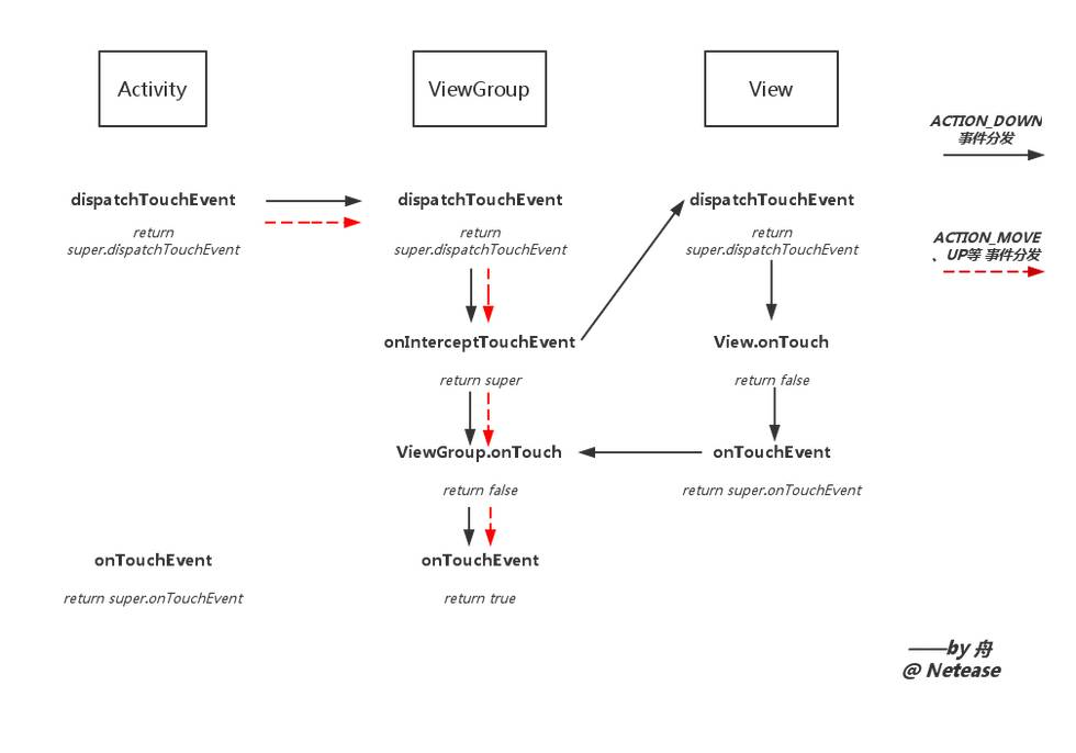事件传递的基本原则:对于一个根ViewGroup来说,点击事件产生后,首先会传递给自身,并调用其dispatchTouchEvent方法,如果这个ViewGroup的onInterceptTouchEvent方法返回true就表示它要拦截当前事件,接着调用onTouchEvent来处理这个事件;如果这个ViewGroup不拦截,则将事件传递给子元素,子元素调用其onInterceptTouchEvent方法,如此反复直到最终被处理。