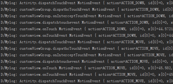 将代码中,CustomView的onTouchEvent返回值为true,则表示可以对接受到的事件进行消耗。我们点击区域3,并滑动一段距离,此时打印log如下: