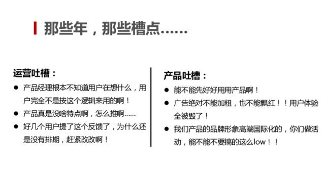 在一个产品的打造过程中,运营、产品、技术人员经常相互吐槽,这是一个团队的正常生态。“存在即合理”,所有槽点的存在都是有价值的;“屁股决定脑袋”,每一个人的职能不同,考虑问题的角度就会不一样。所以,我们要学会尊重别人的专业度和尊重别人的想法。