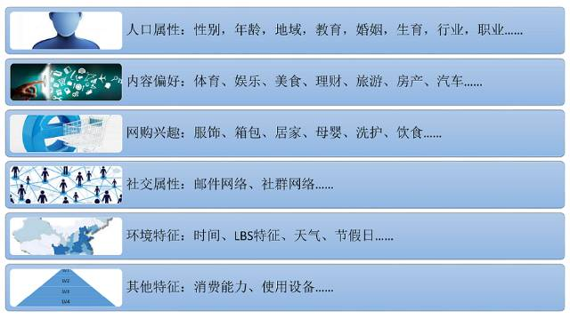 另外还可以加上用户的环境属性,比如当前时间、访问地点LBS特征、当地天气、节假日情况等。当然,对于特定的网站或App,肯定又有特殊关注的用户纬度,就需要把这些维度做到更加细化,从而能给用户提供更精准的个性化服务和内容。
