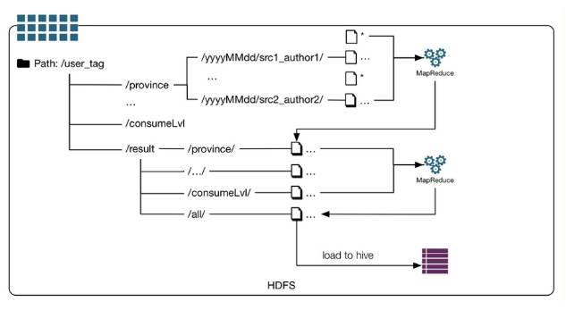 用户画像涉及到大量的数据处理和特征提取工作,往往需要用到多数据来源,且多人并行处理数据和生成特征。因此,需要一个数据管理系统来对数据统一进行合并存储和分发。我们的系统以约定的目录结构来组织数据,基本目录层级为:/user_tag/属性/日期/来源_作者/。以性别特征为例,开发者dev1从用户姓名提取的性别数据存放路径为 /user_tag/gender/20170101/name_dev1,开发者dev2从用户填写资料提取的性别数据存放路径为 /user_tag/gender/20170102/raw_dev2。