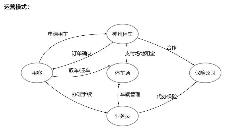 例如,产品经理经常要做的竞品分析以及行业商业模式分析,其实在程序员看来就可以简单的整理成一个商业模式的状态机,用图表的方式图示话。这样便于理解与沟通,也有利于设计和构想适合于自己产品的商业模式。如下图,是曾经做过对租车行业的商业模式和运营模式的分析。尝试着将租车行业的各个角色使用类似状态机的方式链接起来,对于各个竞品的比较和分析都是比较方便和直观的。