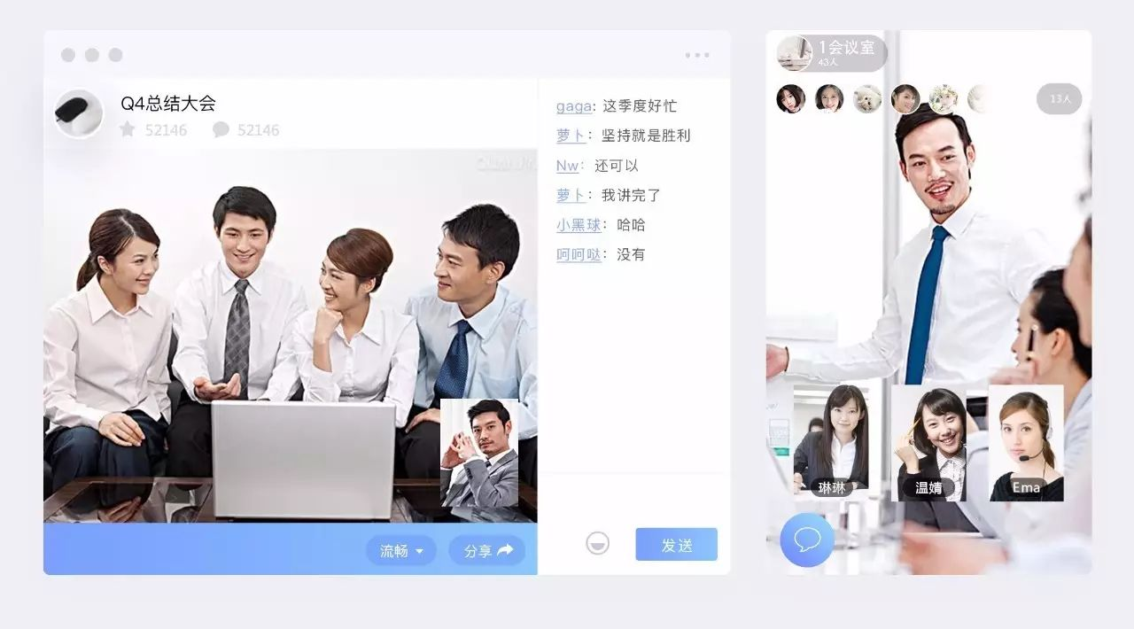 网易云支持 4 人同时语音、视频连麦互动并直播出去,同时支持 4 种主播与连麦者的UI布局方式。