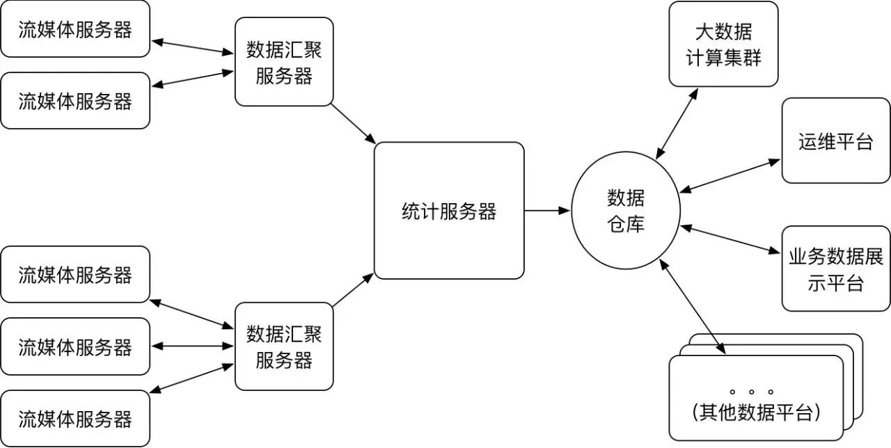 对于每一个区域,会有一个数据汇聚的服务器,负责从流媒体服务器收集数据。最初的元数据,经过数据汇聚服务器汇总、过滤和压缩以后。统一上报到中心集群中的统计服务器。统计服务器会将所有的统计数据,逐一落库,储存在数据仓库中。其余的数据计算集群,会从数据仓库中定时进行读取计算。具体的计算间隔,会根据业务类型不同而不同。例如运维平台会主要读取一些机器级别的数据,进行分析和报警。大数据计算集群则会对数据进行计算,得出优化方向,此处我们稍后再聊。业务数据展示平台则是会实时的输出数据(例如码率和延迟),用于提供给用户和技术支持查询。当然,还有其他各种各样的数据处理服务,这里就不再一一介绍。