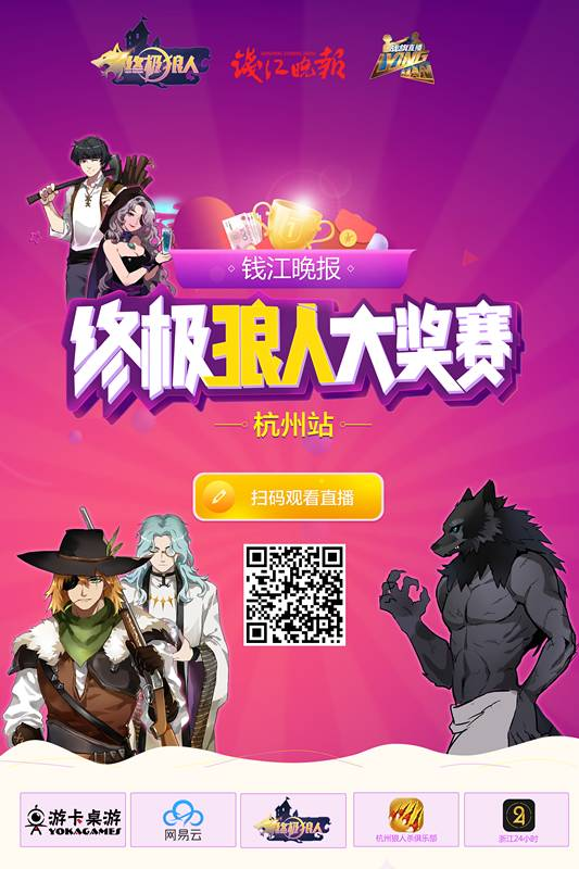 由钱江晚报等主办的终极狼人大奖赛已进入决赛阶段。4万现金大奖吸引众多高手参与,总决赛将在豪华包厢中举行并进行直播。奖金丰厚,冠军独享15000元。