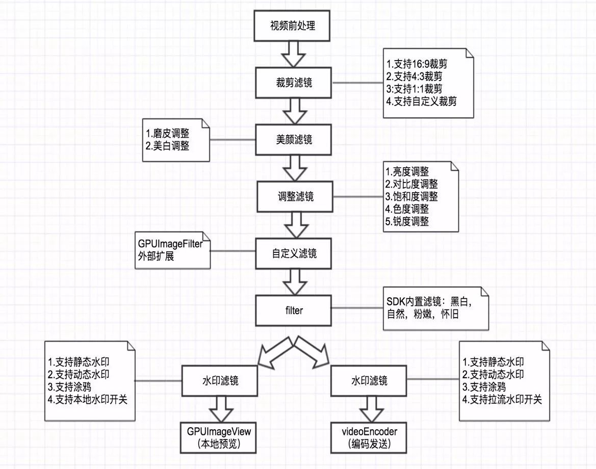 前处理模块也是主观影响主播观看效果最主要的环节。目前iOS端比较知名的是GPUImage,提供了丰富的预处理效果,我们也在此基础上进行了封装开发。视频前处理包含滤镜、美颜、水印、涂鸦等功能,同时在人脸识别和特效方面接入了第三方厂商FaceU。SDK内置4款滤镜黑白、自然、粉嫩、怀旧;支持16:9裁剪;支持磨皮和美白(高斯模糊加边缘检测);支持静态水印,动态水印,涂鸦等功能。音频前处理则包括回声抑制、啸叫、增益控制等。音视频都支持外部前处理。