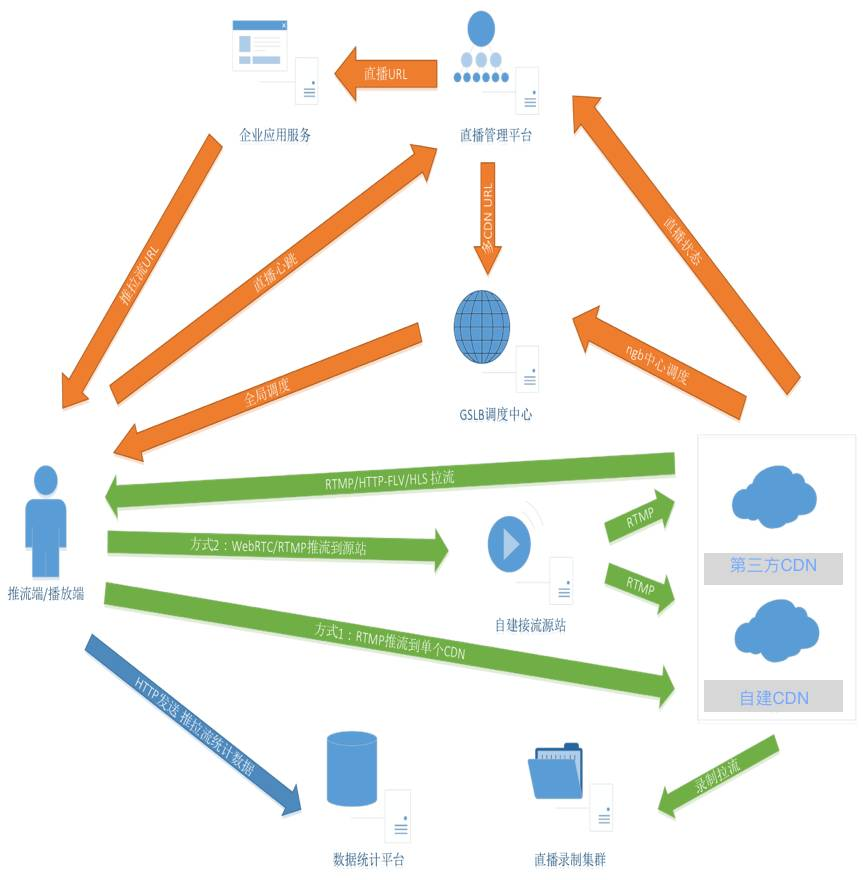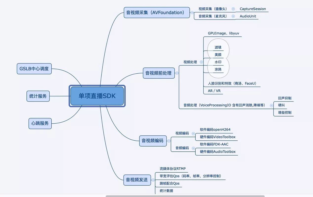 而我们今天需要讲的就是推流这部分,它主要包括音视频采集,音视频前处理,音视频编码,推流和传输4个方面。但是由于网络的复杂性和大数据的统计,推流还需要有全局负载均衡调度GSLB(Global Server Load Balance),以及实时的统计数据上报服务器,包括提供频道管理给用户运营,因此推流SDK需要接入GSLB中心调度,统计服务器,心跳服务器,用于推流分配到网络最好的节点,有大数据的统计和分析。