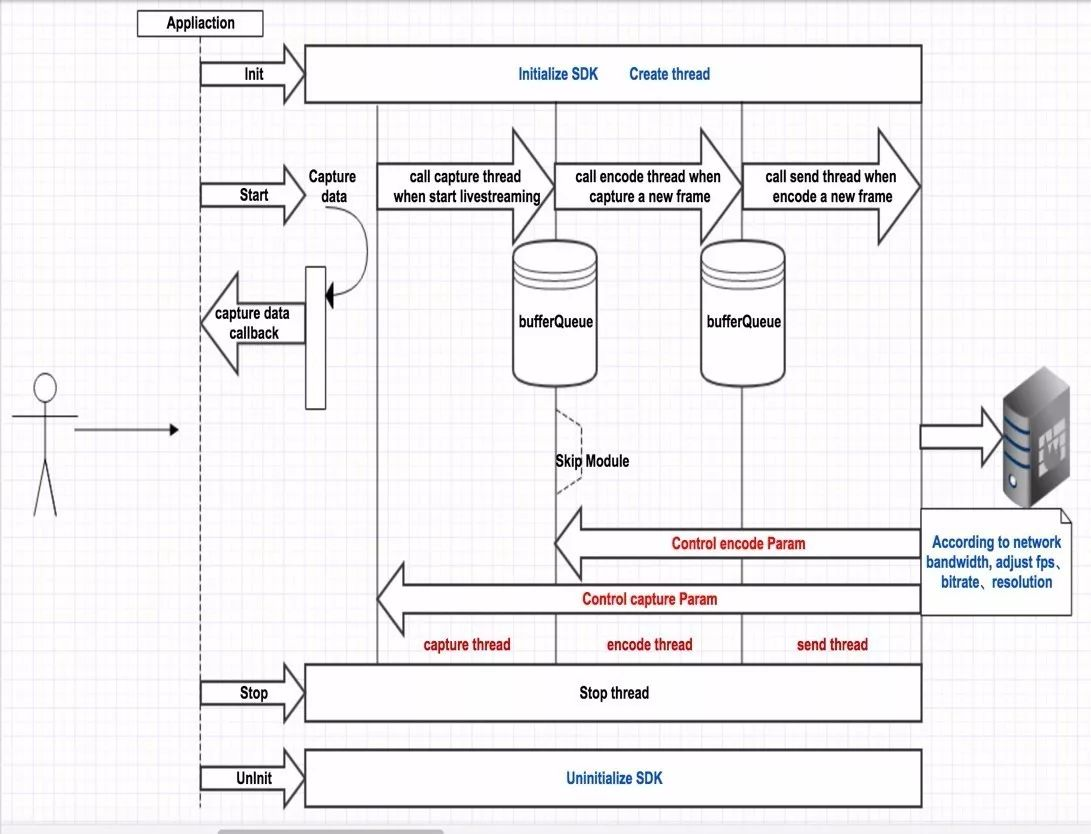 下图是直播的主要流程,用户初始化SDK,创建线程,开始直播,音视频数据采集,编码,发送。在发送线程下,音视频数据发送,QoS开启,根据网络实时评估带宽,调整帧率,码率控制编码器参数,同时触发跳帧,调整分辨率控制采集分辨率参数。用户停止直播,反初始化SDK,销毁线程。QoS&跳帧可以有效的解决用户在网络不好的情况下,直播卡顿的问题。在不同的码率和分辨率情况下,都能够做到让用户流畅地观看视频直播。