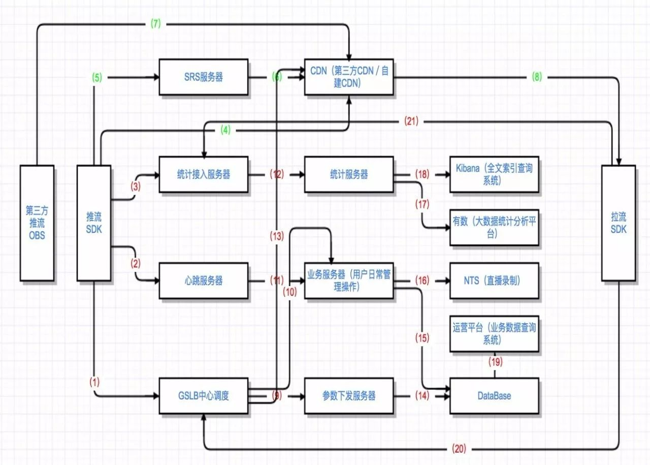 下图涵盖了直播相关的所有服务,红色小标的线条代表指令流向,绿色小标的线条代表数据流向。