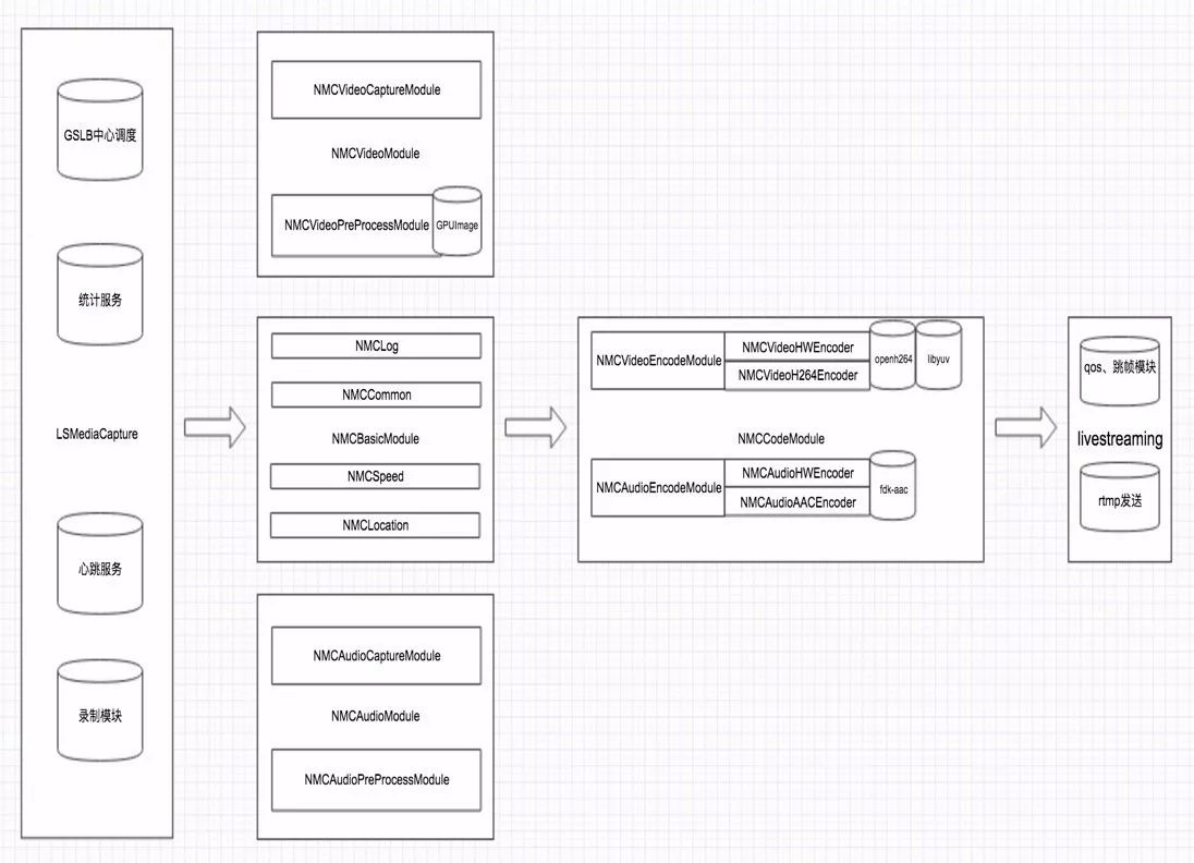 鉴于推流的主流程分为上述描述的4个部分:音视频采集、音视频前处理、音视频编码、音视频发送。因此将推流SDK进行模块划分为LSMediacapture层(对外API+服务器交互)、视频融合模块(视频采集+视频前处理)、音频融合模块(音频采集+音频前处理)、基础服务模块、音视频编码模块、网络发送模块。