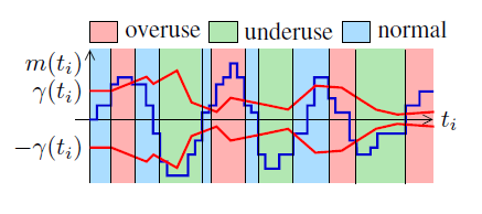 到达时间滤波器计算出每组数据包的延迟梯度之后, 就要据此判断当前的网络拥塞状态, 通过和某个阈值的比较, 高过某个阈值就认为时网络拥塞,低于某个阈值就认为网路状态良好,因此如何确定阈值就至关重要。这就是过载检测器的主要工作,它主要有两部分, 一部分是确定阈值的大小, 另一部分就是依据延迟梯度和阈值的判断,估计出当前的网络状态,一共有三种网络状态: overuse underuse normal,我们先看网络状态的判断。
