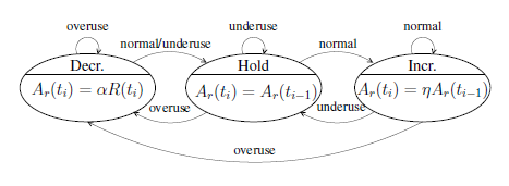 速率控制器主要实现了一个状态机的变迁, 并根据当前状态来计算当前的可用码率, 状态机如下图所示: