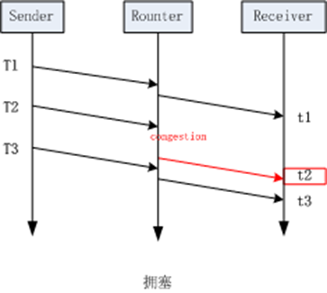 左边这幅图的场景是理想状况下的网络传输, 没有任何拥塞, 按我们上面提到的公式(2)来计算,这种场景下, 所计算到的延迟梯度应该为0。而右边这幅图的场景则是发送拥塞时的状况,当包在t2时刻到达时, 该报在网络中经历过一次因拥塞导致的排队, 这导致他的到达时间比原本要完, 此时计算出的延迟梯度就为一个较大的值,通过这个值, 我们就能判断当前网络正处在拥塞状态。