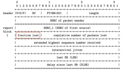 WebRTC通过RTCP协议的Receive Report反馈包来获取接收端的丢包率。Receive Report包中有一个lost fraction字段, 包含了接收端的丢包率,如下图所示。