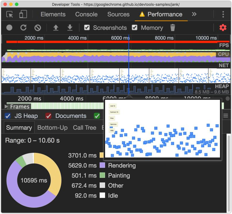 当你页面运行网页的优化版本,蓝色方框移动速度会变快。为了更好的检测出性能问题,我们记录网页非优化的版本。