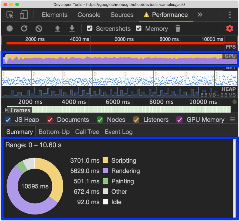 在FPS下面就是CPU图表,图表中的颜色和面板底部的Summarytab中的颜色是匹配的。CPU颜色越丰富,代表在录制过程中CPU已经最大化了。如果这段丰富颜色的长条比较长,这就暗示网站应该想办法让CPU做更少的工作了,也就是说代码逻辑需要做优化了。