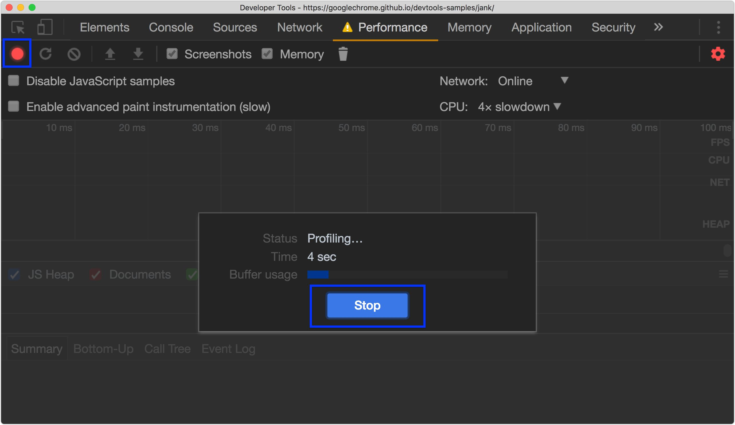 Stop按钮(见图示),DevTools停止记录,并开始处理数据,随后将处理结果显示在performance面板中,如下图
