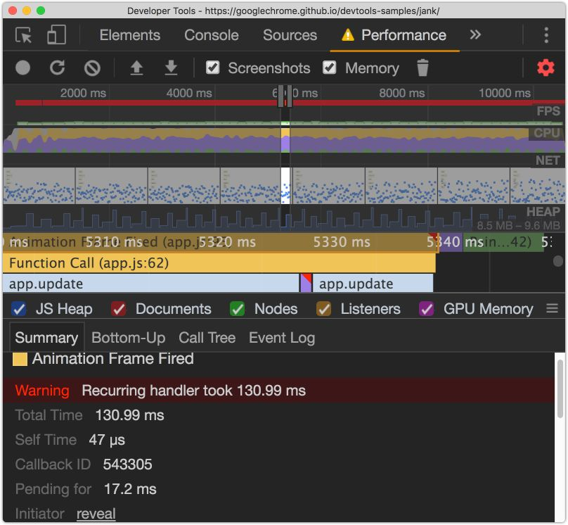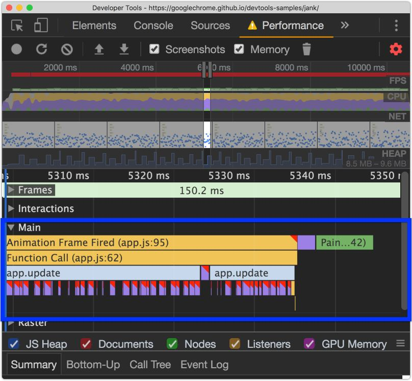 可以通过单击、鼠标滚动或者拖动来选中FPS,CPU或NET图标中的一部分,Main部分和Summary Tab就会只显示选中部分的录制信息。注意Animation Frame Fired事件右上角的红色三角形图标,该红色三角图标是这个事件有问题的警告。